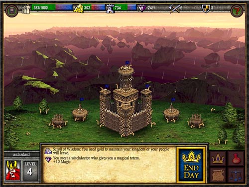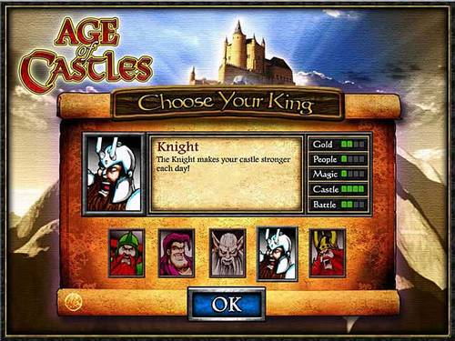 In a distant realm of sword and sorcery, a great evil had swept across the land. Demons from the underworld and their evil minions poured across the kingdoms of man, until the great cities lay in ruin, and there were naught but a handful of cowering souls remaining. Choose your king, as you alone must travel to the end of the world, build a mighty castle, slay the undead hordes, and convert the people of the land to loyal subjects of your domain... in the Age of Castles!