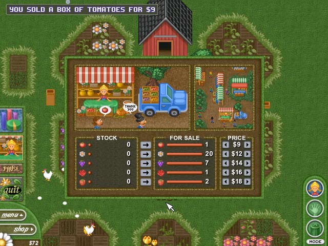 Step into the gardening business in this intriguing simulation game, where you build and decorate your own garden of flowers, animals and vegetables. Follow the market trends, get to know your customers and serve ripe crops down at the town market to expand and get your business profitable. Harvest many different crops and enrich your land with animals as you earn more than 10 special awards. Design your garden the way YOU like it with Alice Greenfingers!