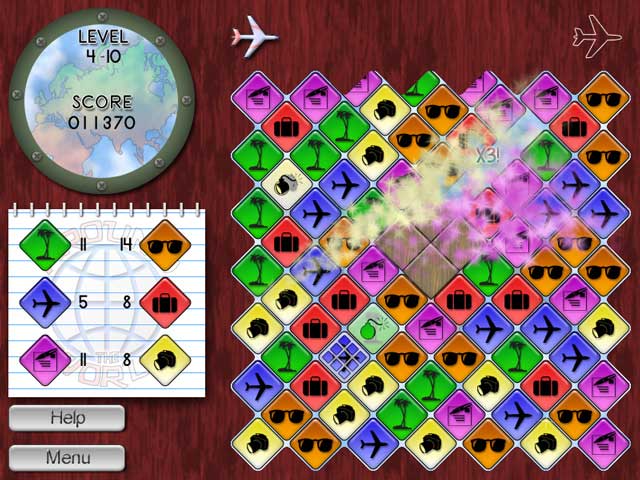 Prepare yourself for a trip Around the World with this inventive block-matching puzzle game! During your tour, you'll discover the wonders of ten cities by completing the levels on time! Around the World features 100 levels organized in 20 different layouts with many potent power-ups. You will gather up to 18 awards by performing matches and combos! So, pack your bags and let's go!