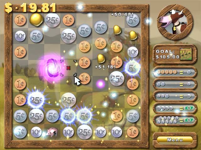 Four quarters, ten dimes, five pennies? The choice is yours as you help Buck the Cow save the farm in this original game of coin counting! Cash Cow features two unique ways to play. Rebuild the farm in Classic Mode or race against the clock in Timed Mode. With gorgeous landscapes, explosive power-ups and dazzling special effects, Cash Cow is a brand new experience that you won't want to put down!
