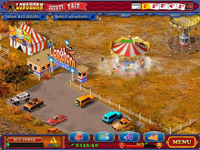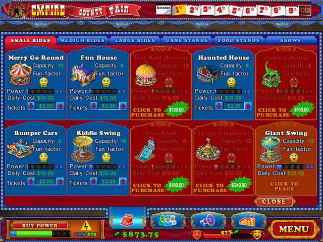 You are in charge of running your local county fair. What will you do first? Install the biggest, most fabulous rides? Set up tasty food concessions to sell deep fried soda and other delicacies? Fire the staff and assemble your dream team of carnies? Now is your chance to give it whirl! County Fair combines the best of two hot game genres as you set prices, hire staff and select the hottest new rides and attractions while keeping your customers safe, healthy and coming back for more!