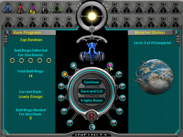 Ricochet around the Galaxy in this dynamically brilliant breakout action game! Trek across 216 awesome levels, with thousands more online, earning new ranks in the Galactic Tournament, by yourself or with a friend. Play the re-energized Ring Game, winning new balls and ships with unique specialties to give you the edge! Control your ball with the wildly innovative Recall feature...once you've tried it, you can't go back! Travel to the stars and beyond in your glorious quest to become the Ringmaster Grand Champion!