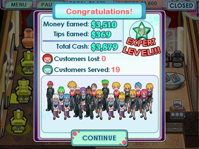 Help Sally spread her salon savvy in this colorful and engaging challenge! Work with Sally to beautify everyone from little old ladies to punk rockers in 10 unique salon locations. Wash, dye, cut, style and more in 50 levels of frantic, but fashionable, fun. Use your earnings to hire helpful employees and purchase salon upgrades to keep your clients looking and feeling their best! Only the stylist with the happiest (and best-looking!) customers will make the cut in this frenzy of family fun!