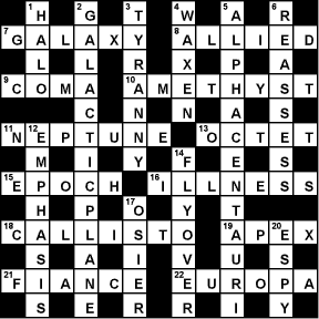 An astronomy crossword puzzle! This one is quite tricky and contains a couple of questions that are not directly related to astronomy. Good luck.
